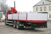 Кран-манипулятор на базе шасси Ford с колесной формулой 6х2. Установлен КМУ с грузовым моментом 13,5 тм, при этом длина бортовой платформы до 8м. Масса перевозимого груза около 14-15т.